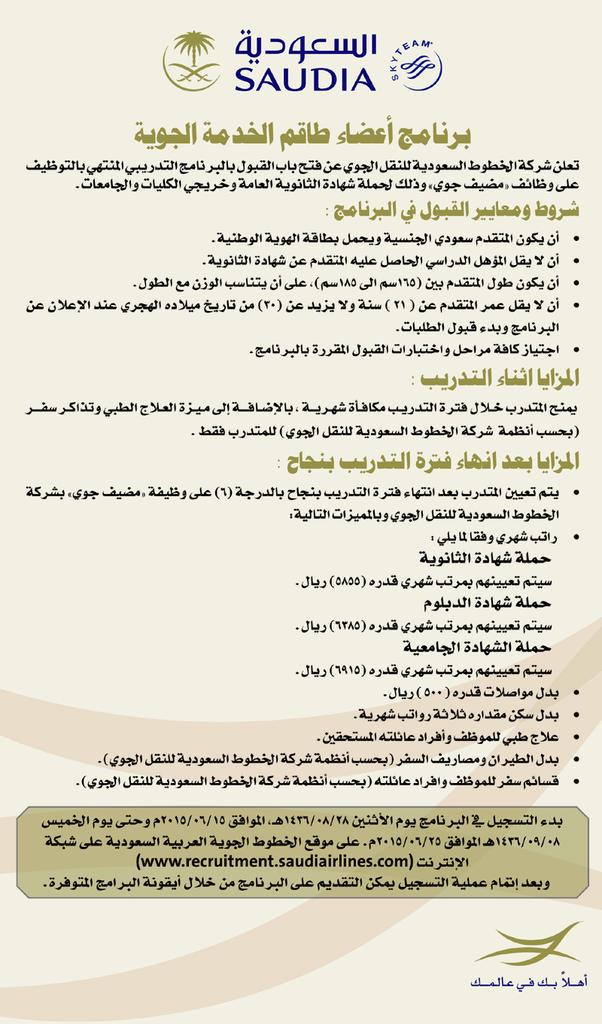 السعودية Saudia On Twitter يسر الخطوط السعودية للنقل الجوي الإعلان عن فتح باب القبول في البرنامج التدريبي المنتهي بالتوظيف لوظيفة ملاح المقصورة لطلبات التقديم يرجى زيارة بوابة التوظيف الإلكترونية Https T Co Avgispksng Https T Co 05bnsnesz8