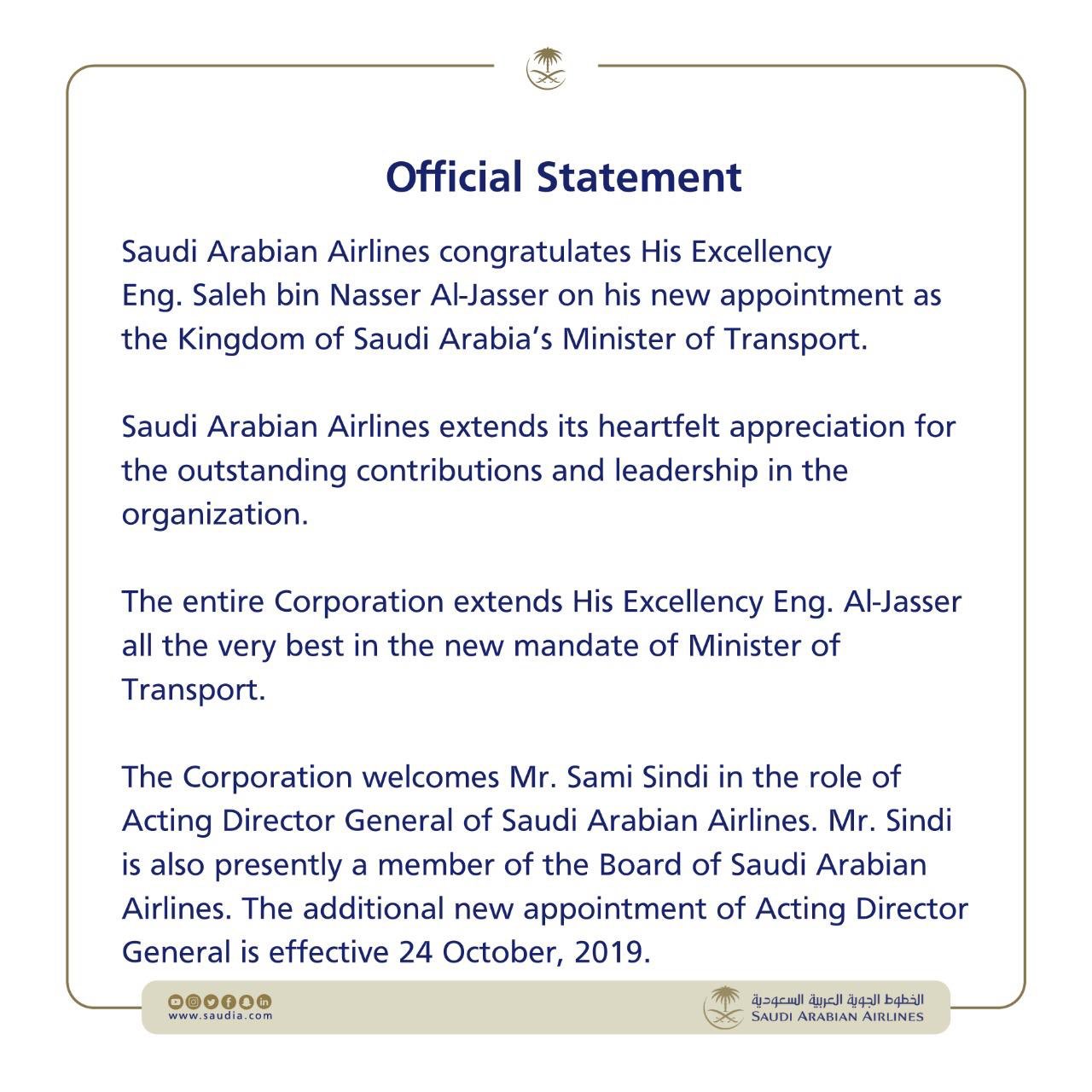 المركز الإعلامي الخطوط السعودية On Twitter Saudi Arabian Airlines Congratulates His Excellency Eng Saleh Bin Nasser Al Jasser On His New Appointment As Minister Of Transport The Entire Corporation Extends Its Best