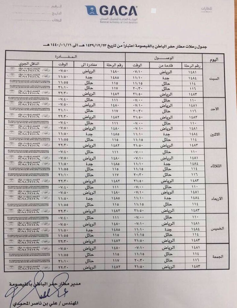 شبكة الحفر A Twitter جدول رحلات مطار حفرالباطن بـ القيصومة ويبدأ العمل به اعتبارا من تاريخ 1440 8 18هـ