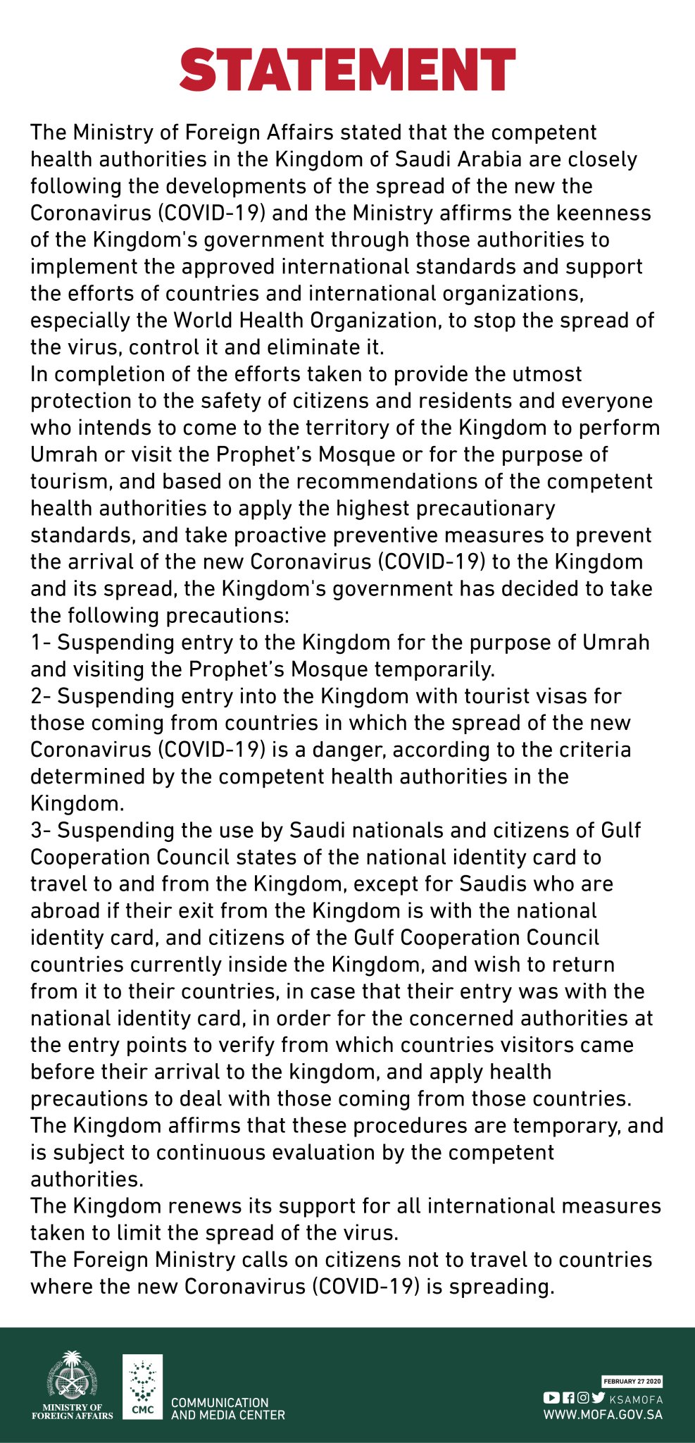 Foreign Ministry On Twitter Statement Proactive Preventive Measures To Prevent The Arrival Of The New Coronavirus Covid19 To The Kingdom